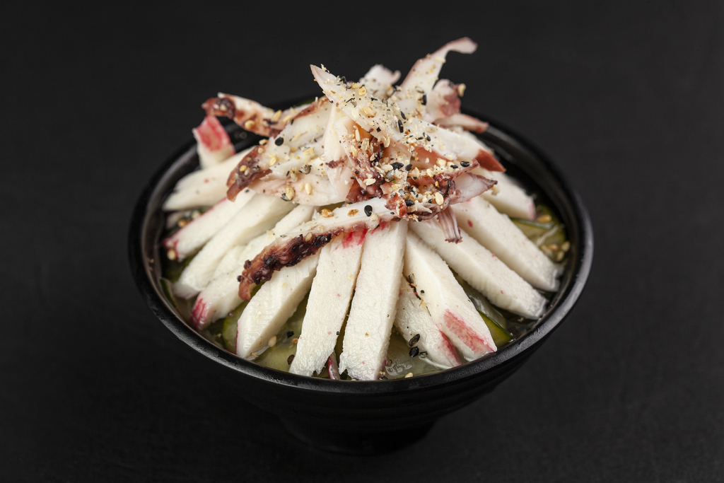 Missoshiro, sunomono especial, oyoza, shimeji, shitake, anéis de lula empanados, bolinho de arroz, pipoca de camarão.